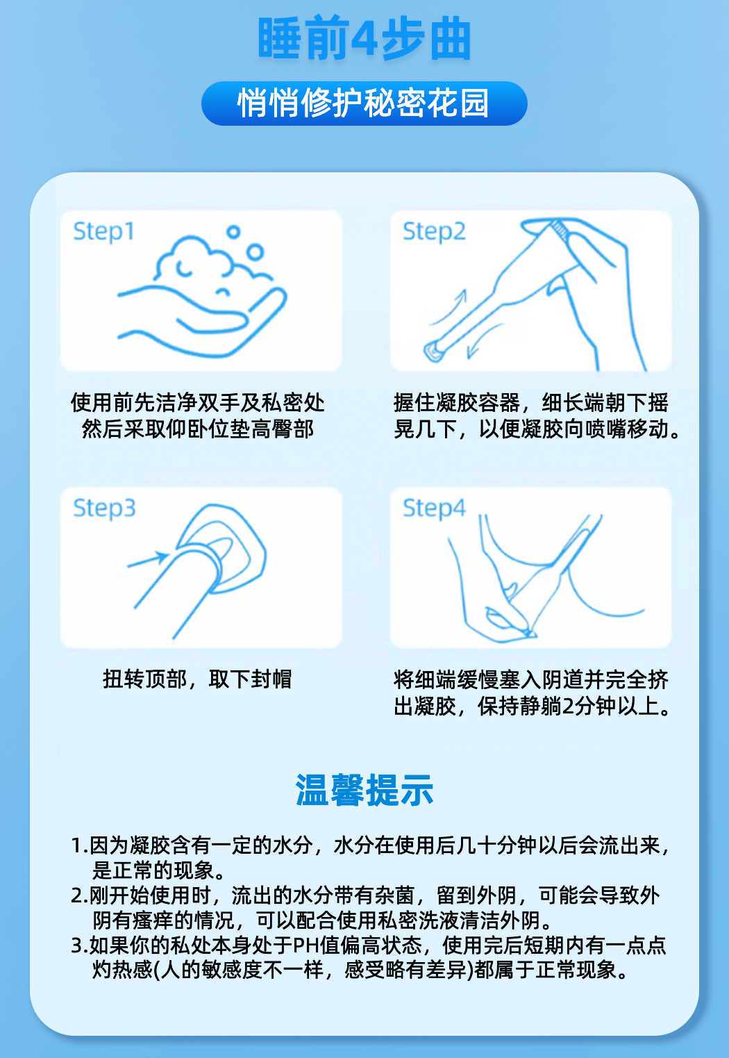 使用后:保持平躺 15 分钟,避免立即起身,期间无需冲洗阴道。
