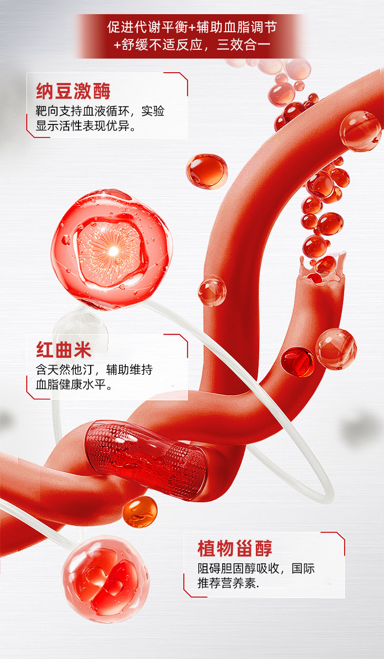 【配料表】山梨糖醇、纳豆粉、植物甾醇(食用量≤2.4克/天,添加量20%)、红曲米、茄子粉、异麦芽酮糖醇(食用量≤100克/天,添加量9%)、大蒜、洋葱、亚麻籽油、硬脂酸镁。