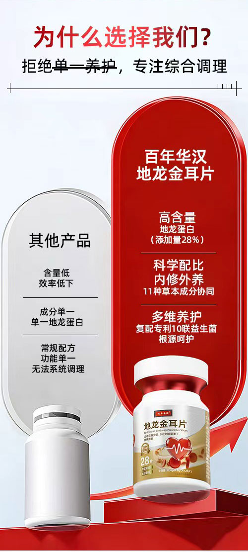 【配料表】地龙蛋白(添加量28%)、D-甘露糖醇,山梨唐醇、微晶纤维素、刺梨、蒲公英、人参(人工种植≤5年,添加量4%)、金顶侧耳(添加量2%) 复合益生简(鼠李糖乳酪杆菌HC1509、动物双歧杆菌动物亚种HSLA-009、唾液链球菌嗜热亚种FP13-03、植物乳植杆菌HC1775、长双歧杆菌长亚种HC2904、嗜酸乳杆菌HC1356、副干酪乳酪杆菌HC1306、干酪乳酪杆菌HC1378、罗伊氏粘液乳杆菌HC1602、短双歧杆菌HC2953)、桑叶、灵芝,黄精、红曲米、纳豆、桔梗复配被膜剂(聚乙烯醇、羟丙基甲基纤维素,聚乙二醇、二氧化钛、焦糖色、诱惑红铝色淀、麦芽糊精)硬脂酸镁