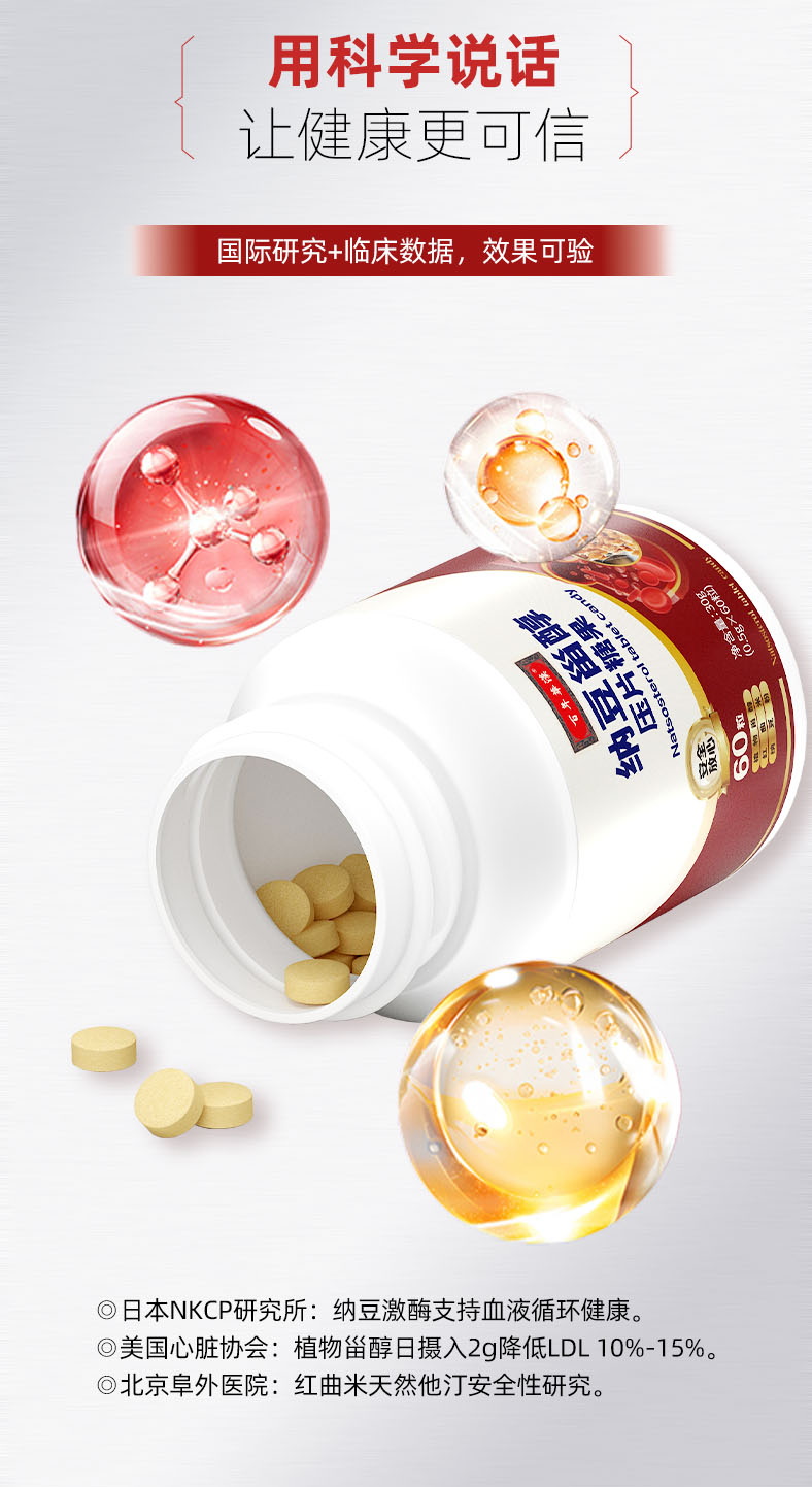 【配料表】山梨糖醇、纳豆粉、植物甾醇(食用量≤2.4克/天,添加量20%)、红曲米、茄子粉、异麦芽酮糖醇(食用量≤100克/天,添加量9%)、大蒜、洋葱、亚麻籽油、硬脂酸镁。