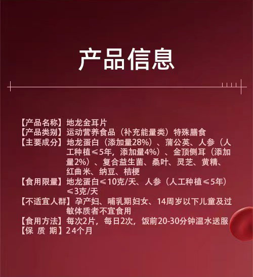 【产品名称】地龙金耳片 运动营养食品(补充能量类)特殊膳食